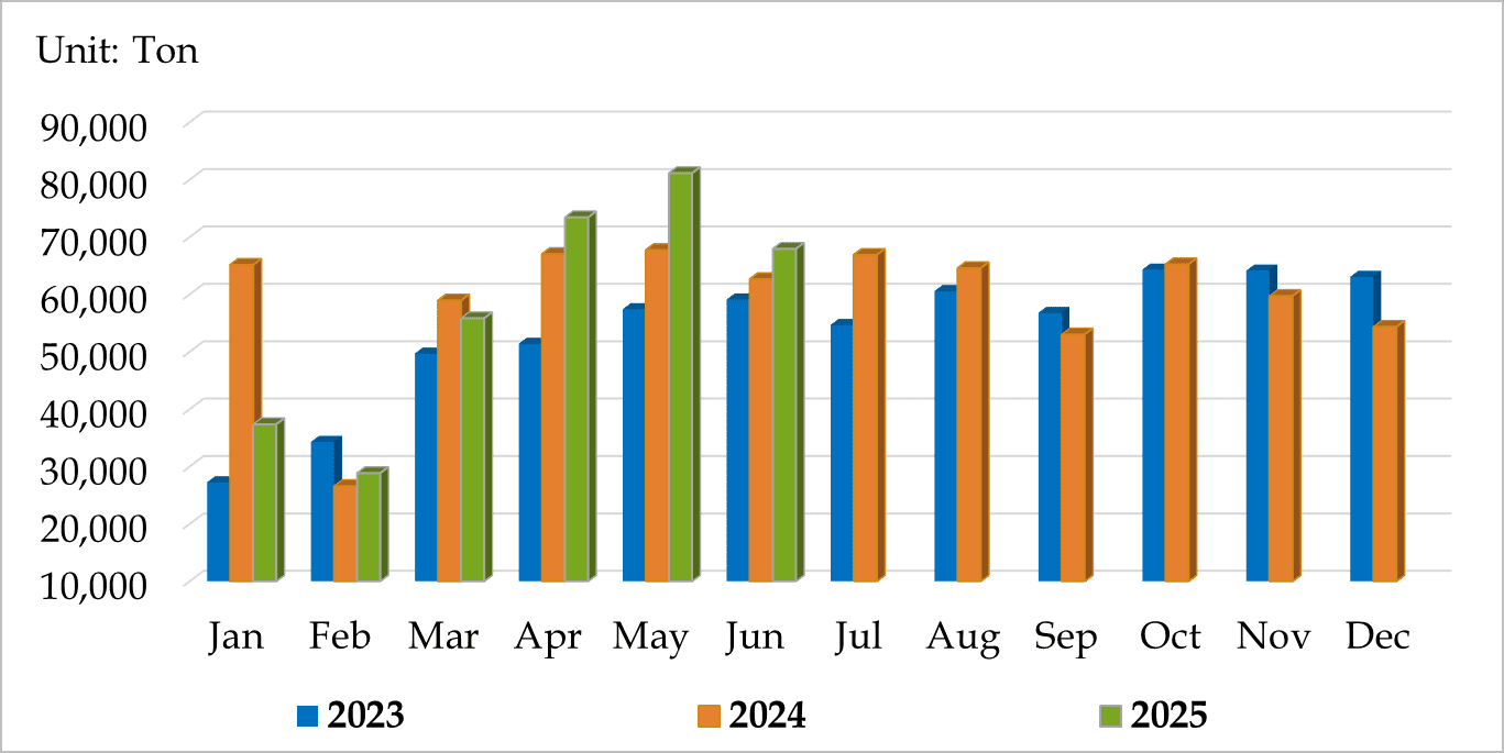 2023: 2,794,000 tons 2024: 2,491,000 tons 2025: 1,586,000 tons
