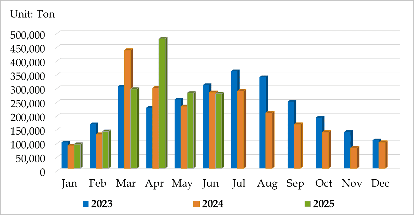 2023: 2,794,000 tons 2024: 2,491,000 tons 2025: 1,586,000 tons